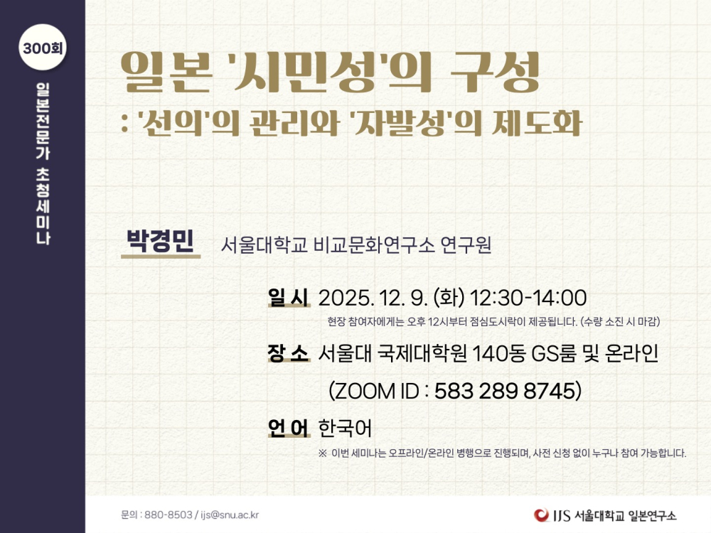 이번 300회 일본전문가 초청세미나는 <일본 '시민성'의 구성>을 주제로 진행하오니, 관심 있으신 분들의 많은 참여 바랍니다.
