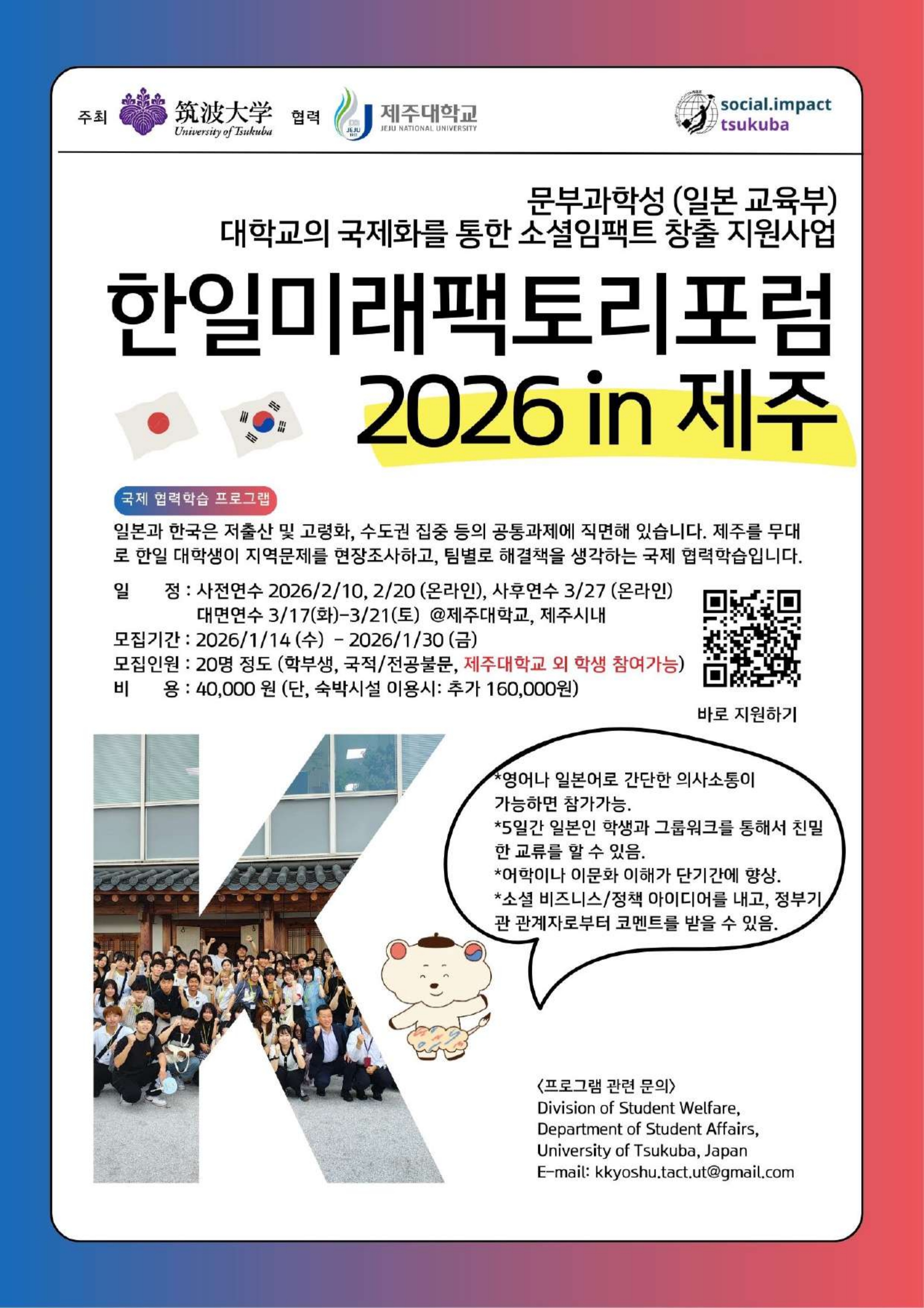 | 제목 | 【일본 쓰쿠바대학교】 한일 국제협력학습 프로그램 모집 안내 |